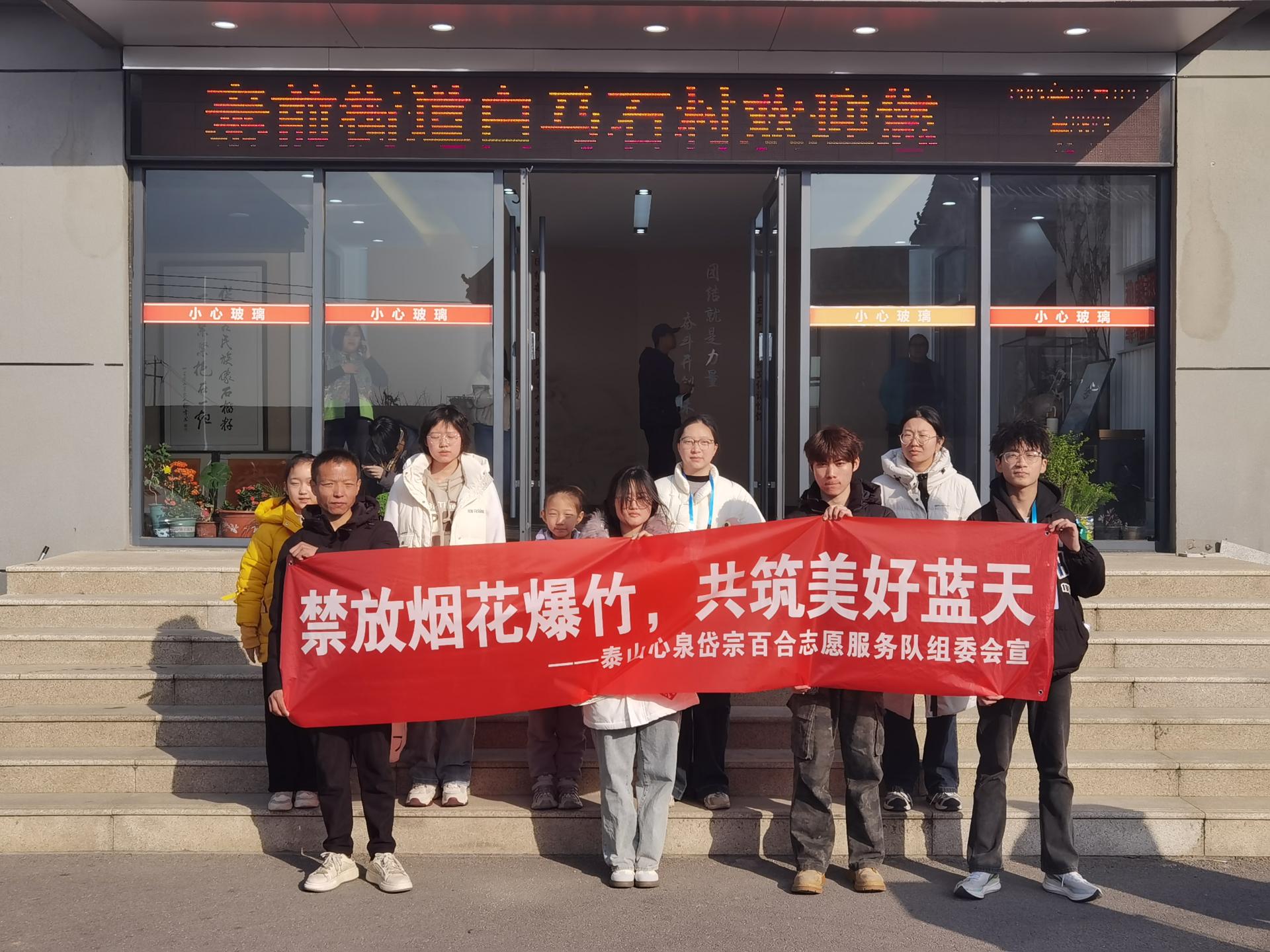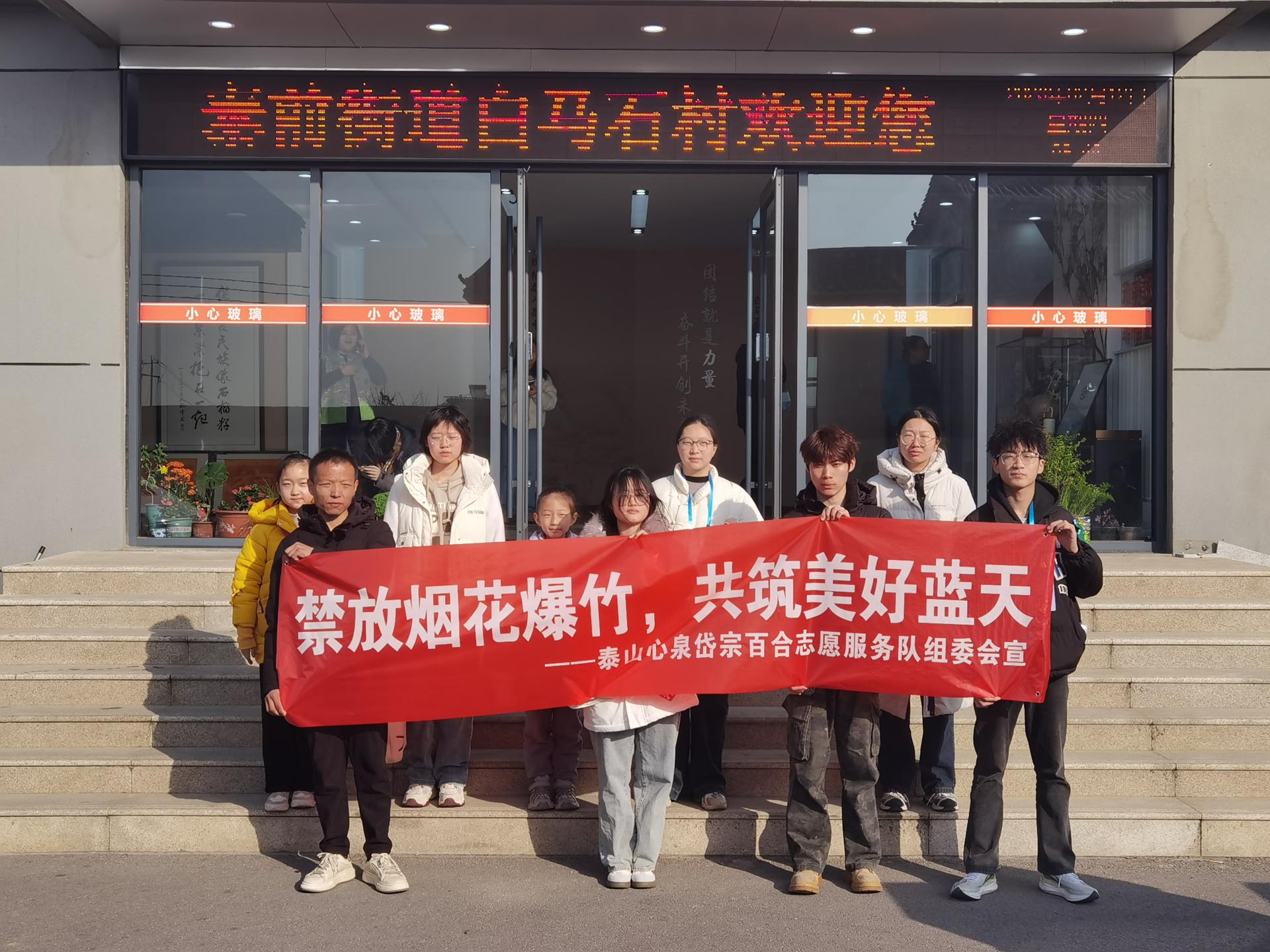 禁放烟花爆竹共筑美好蓝天。泰山心泉岱宗百合志愿服务队组委会组织学生志愿者进社区宣传禁放烟花爆竹,营造安宁祥和的节日氛围
