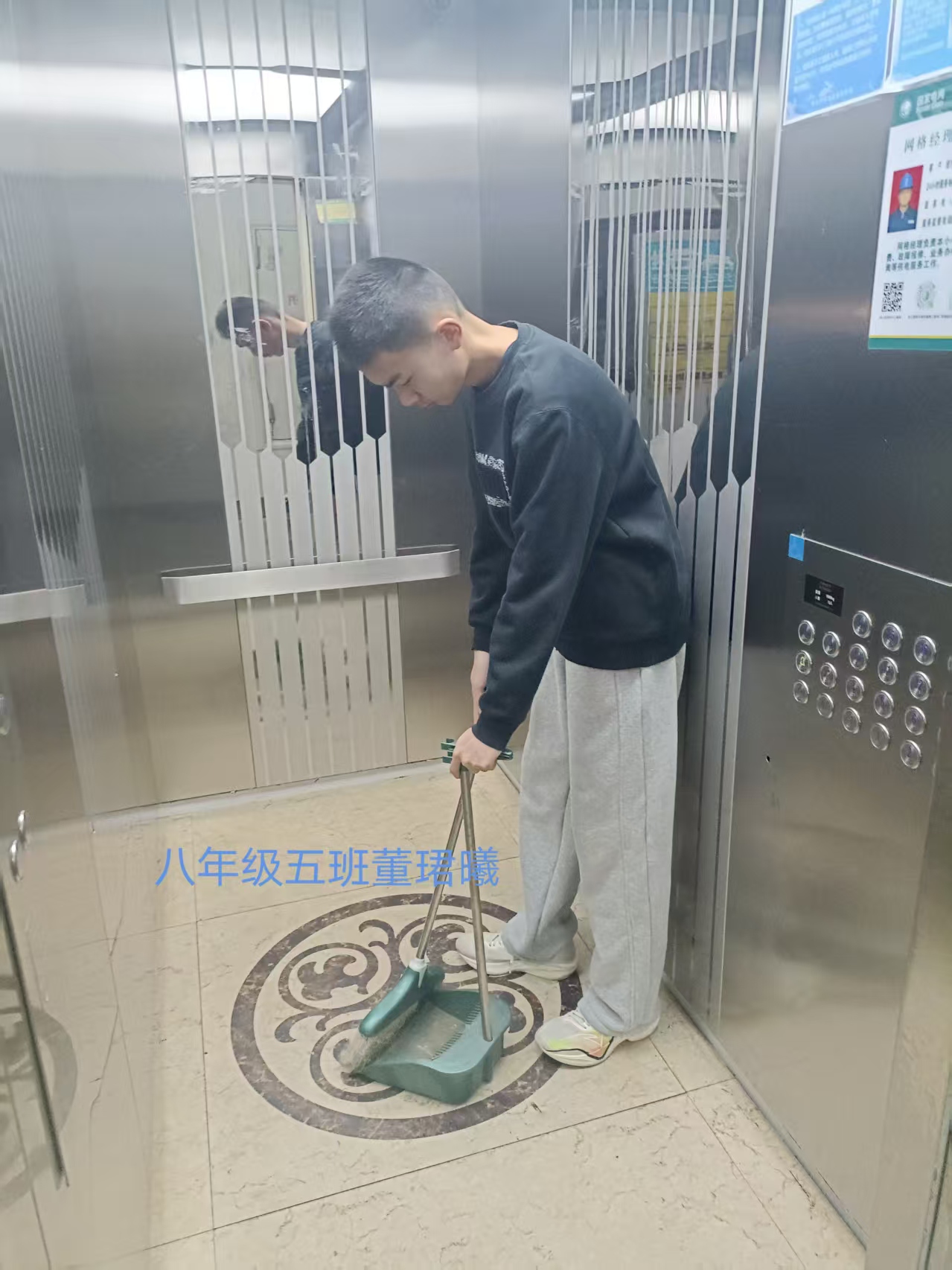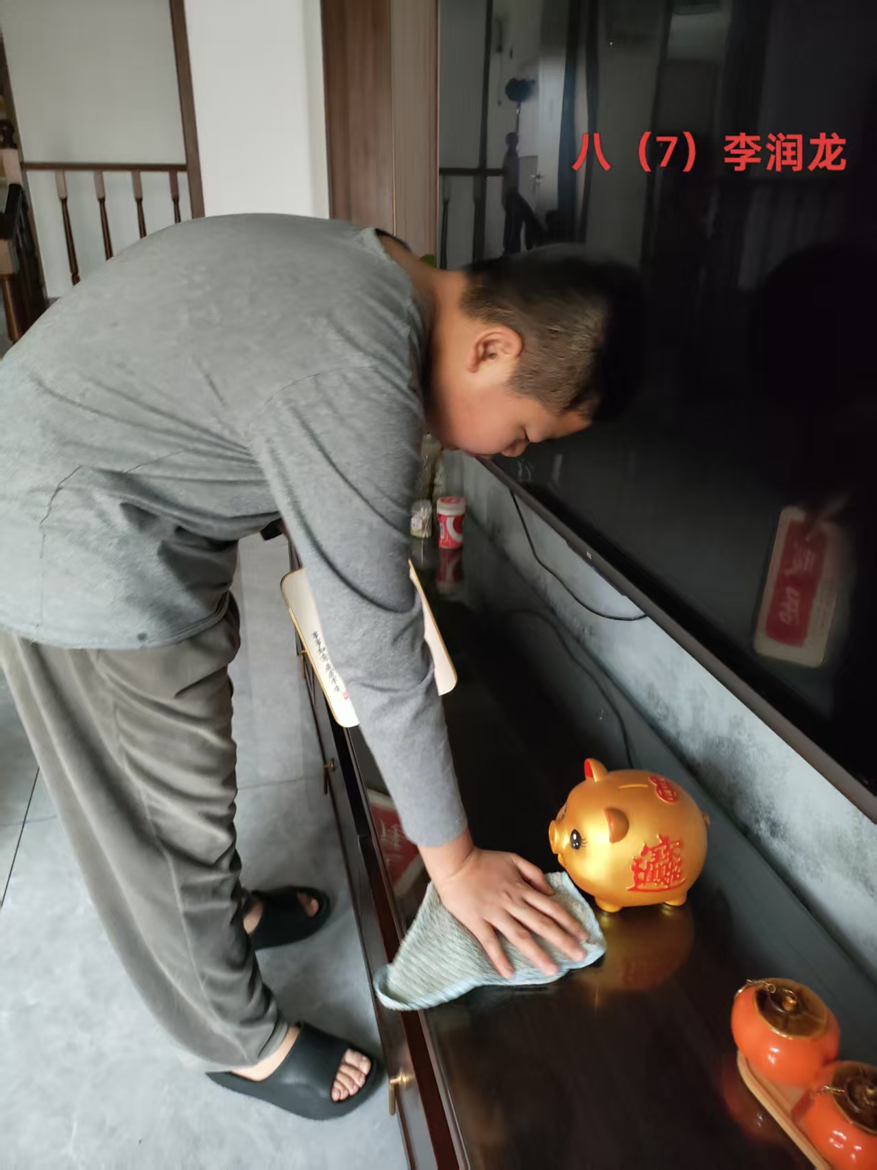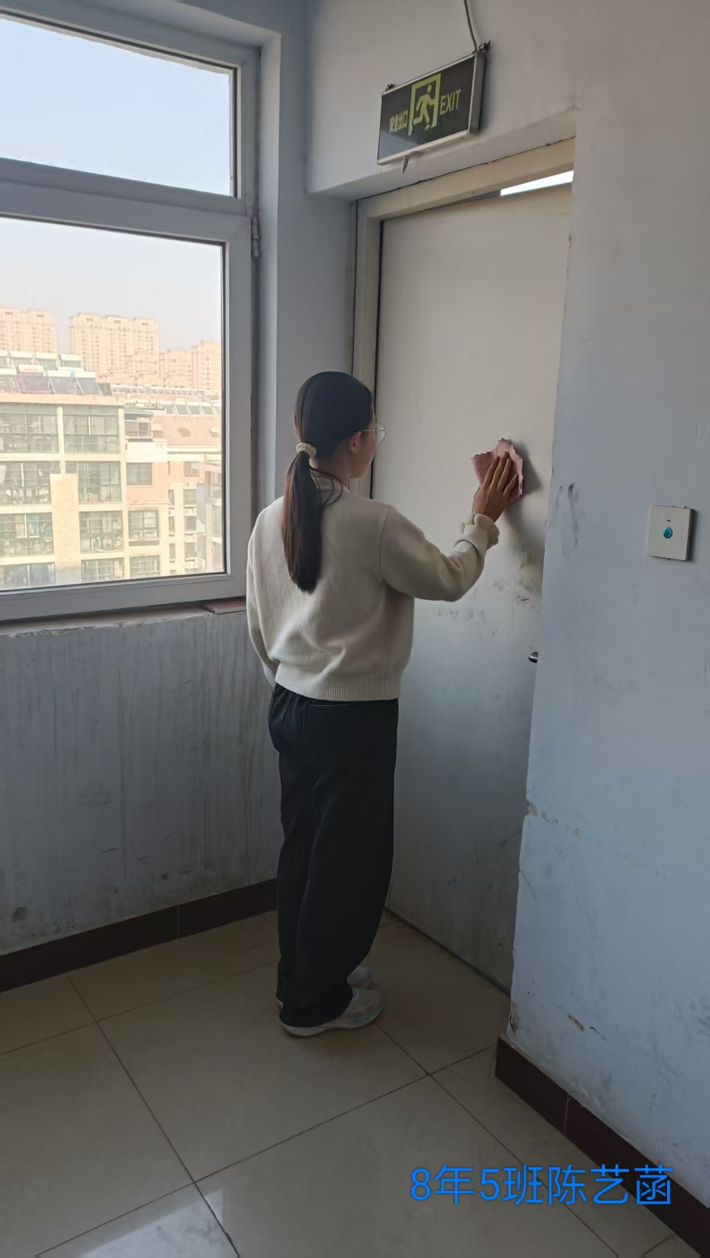 假期里,志愿者根据社区工作人员安排,对社区内的楼梯楼道电梯间进行卫生清洁,在家里做力所能及的家务劳动。