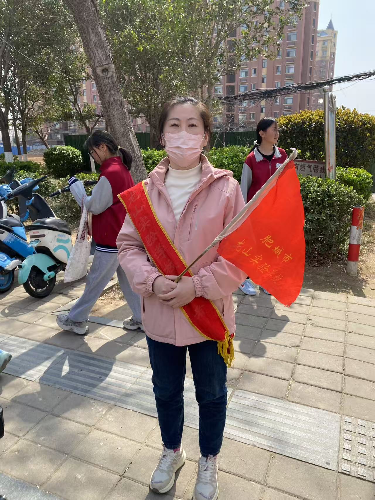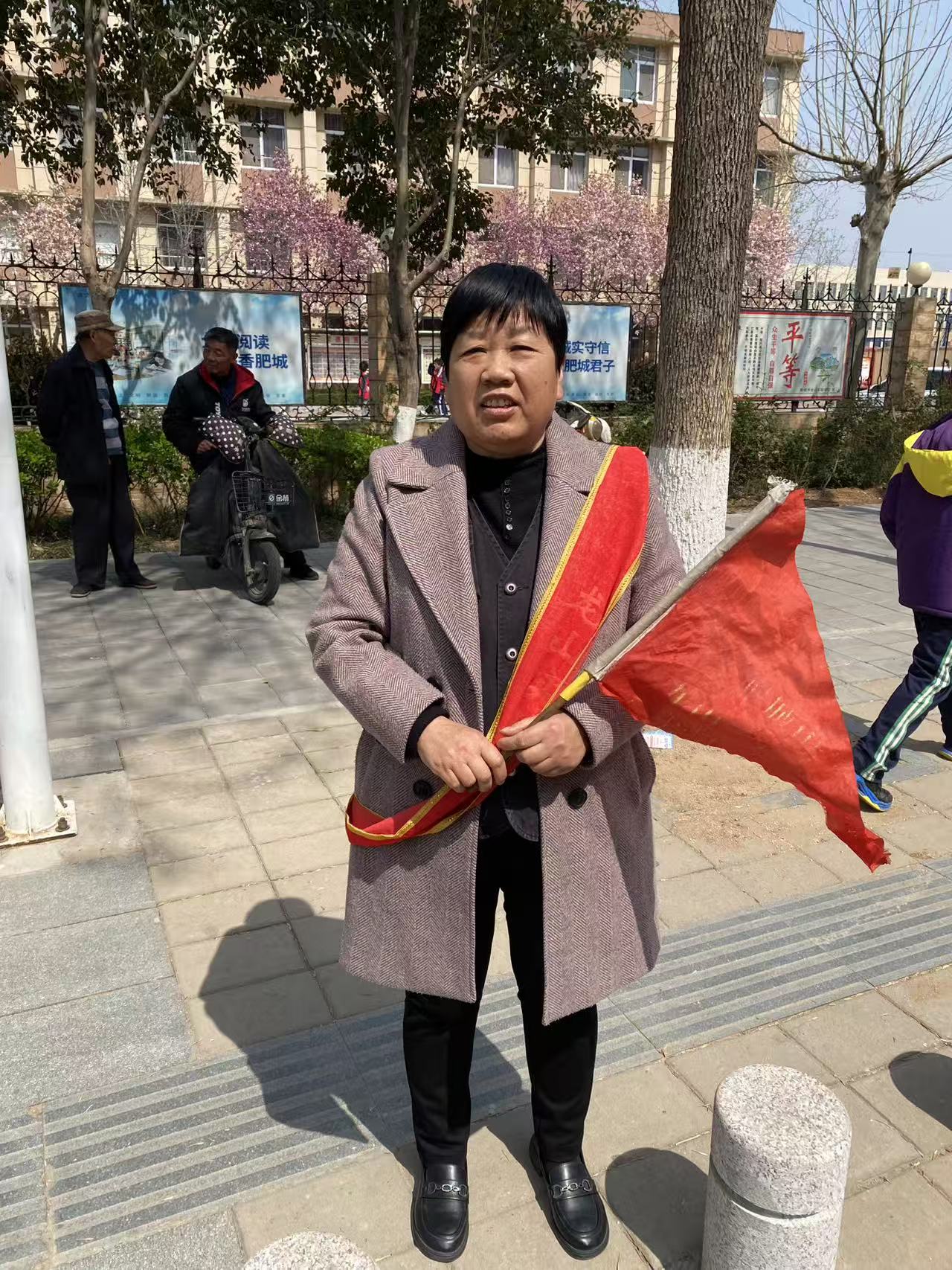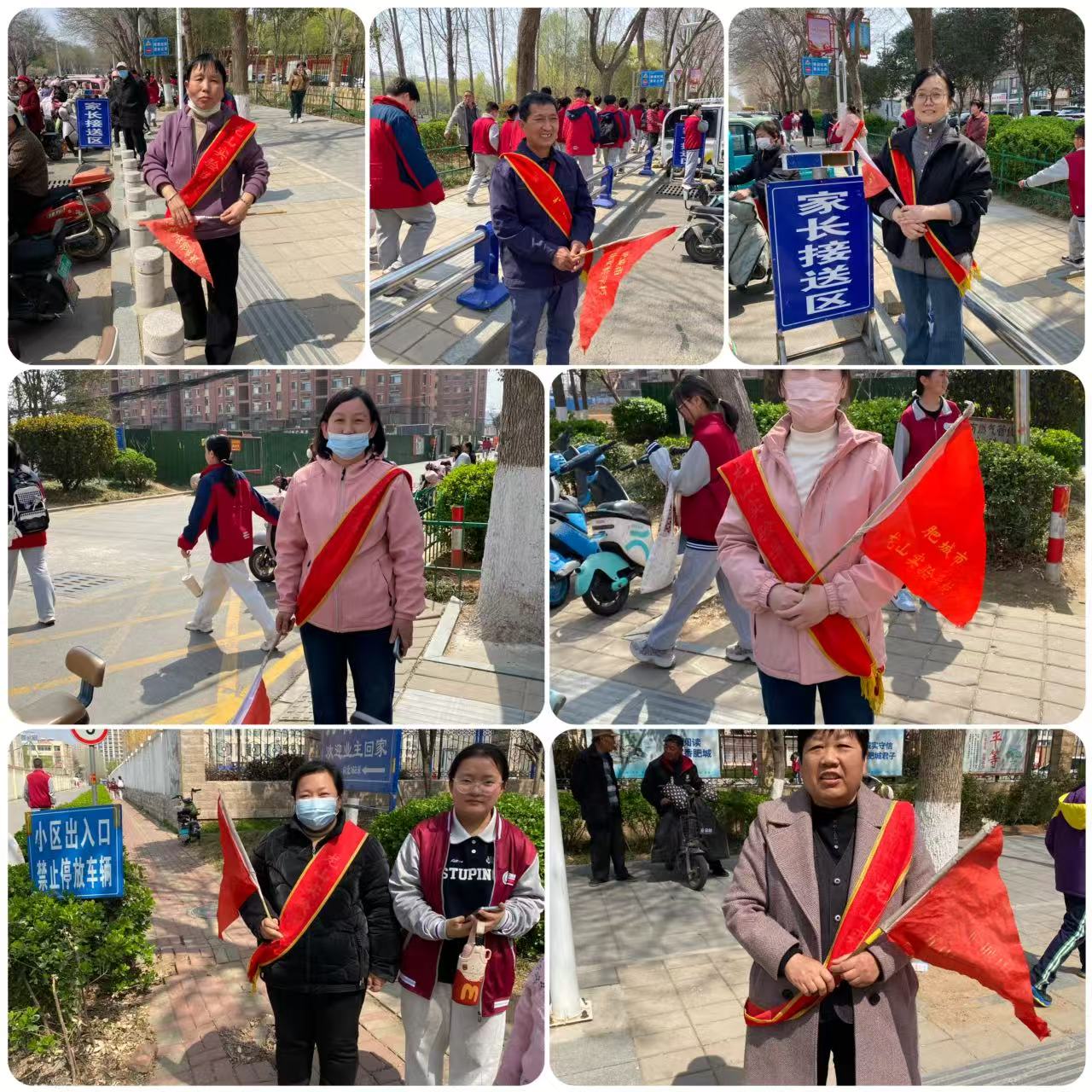 肥城市龙山实验学校朝阳路段护学岗,志愿者提醒社会车辆减速慢行经过校门口,主动礼让行人,不要随意调头,停车