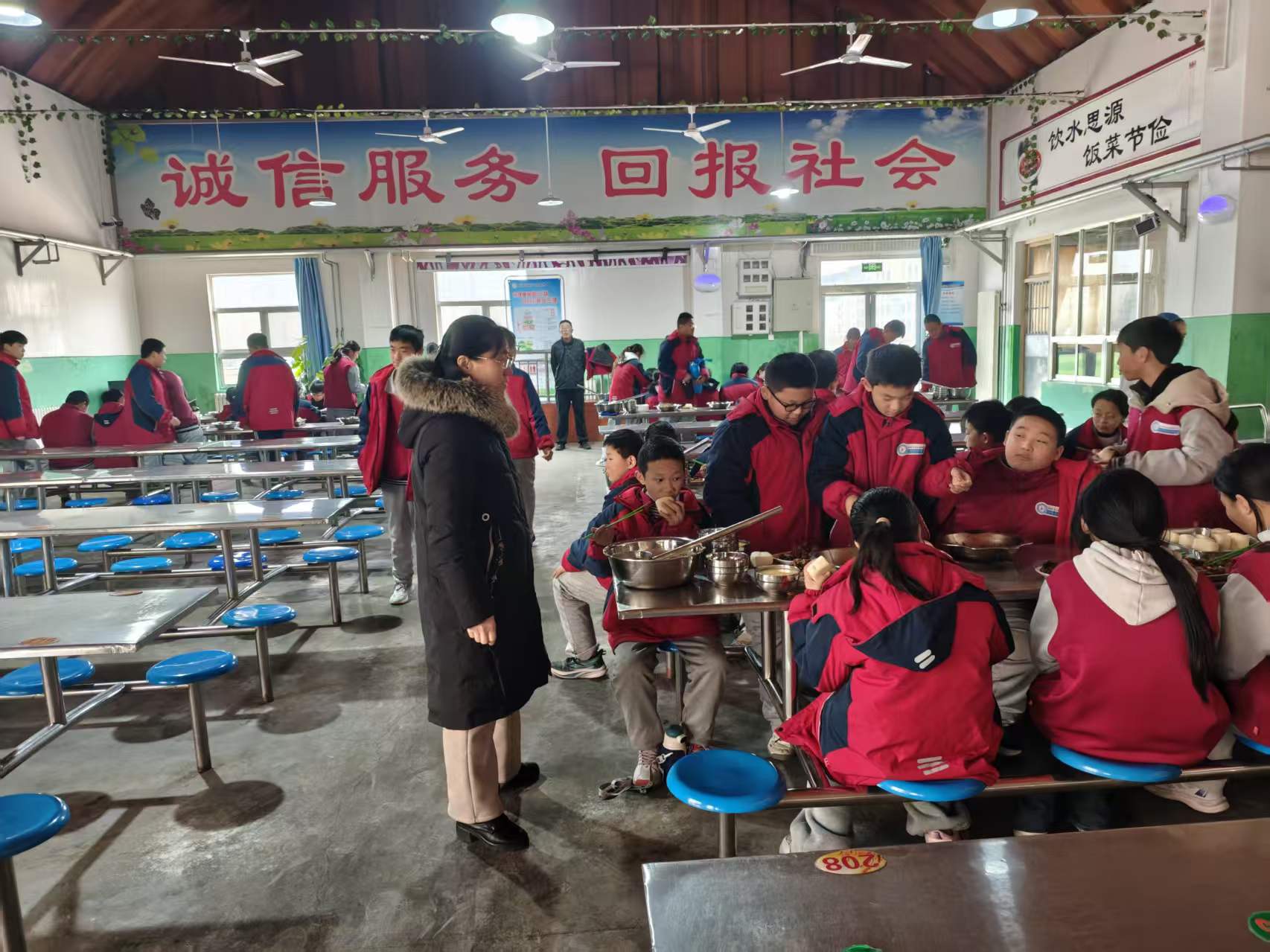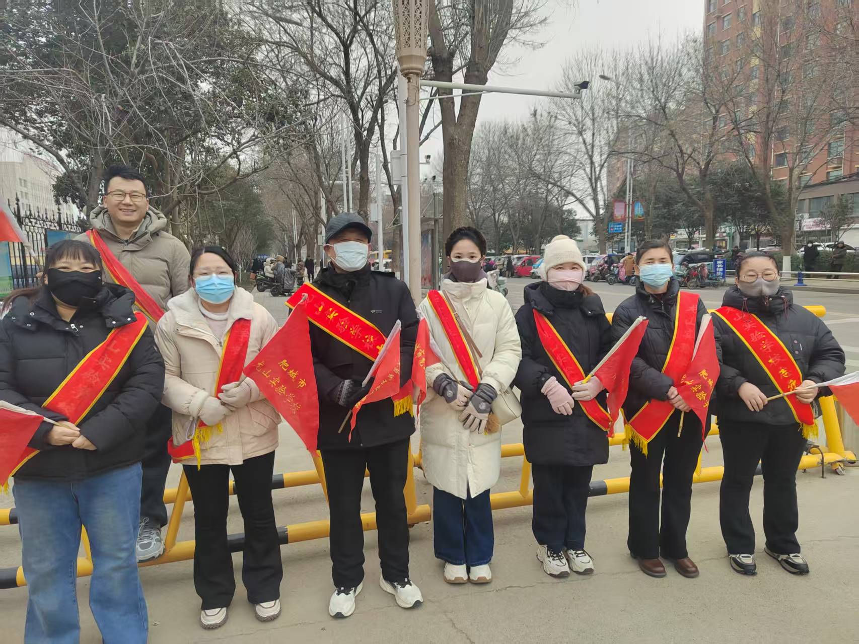 肥城市龙山实验学校朝阳路段护学岗,志愿者提醒社会车辆减速慢行经过校门口,主动礼让行人,社会车辆不要随意调头。