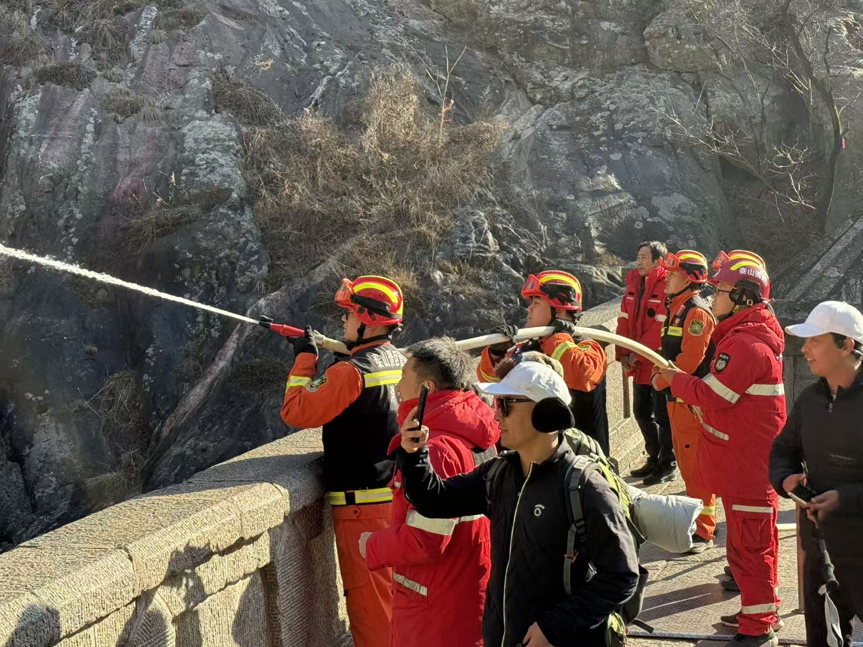 中天门管理区开展泰山防火志愿行,共筑雄峰安全线志愿服务活动,通过向游客宣传森林防火知识,检查劝阻用火,排查巡查安全隐患,开展消防演习等方式,打好防火预防针,共同守护景区青绿。