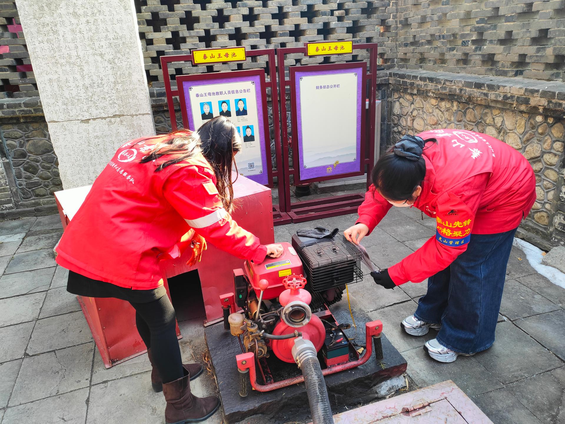 为确保节日期间文物安全,春节前对王母池内进行消防安全检查。排查各殿堂是否存在易燃及危险物品,检查灭火器、消防水泵是否能正常使用,及时消除潜在的消防安全隐患。