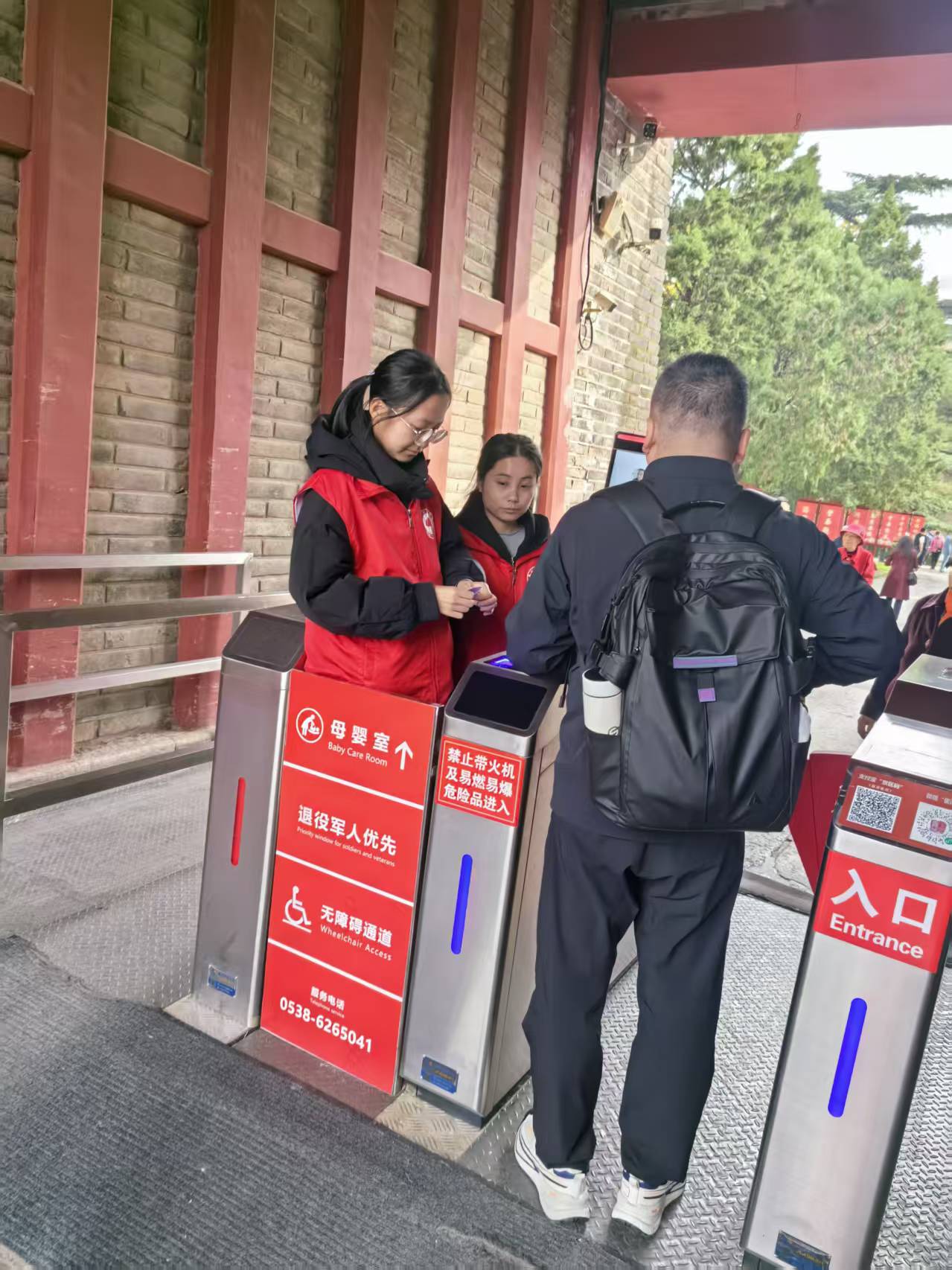 热心志愿服务,有爱心,耐心。细致周到的解答老年群体的问题。包括岱庙卫生间位置,主要景点特征,岱庙门票价格以及导游服务内容等。