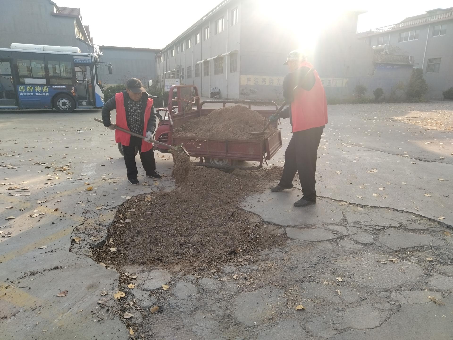 新泰市小协镇陈角峪村党员志愿服务活动,陈角峪村党员志愿者协助卫生清理人员修复村内塌陷路面,确保村民出行安全。