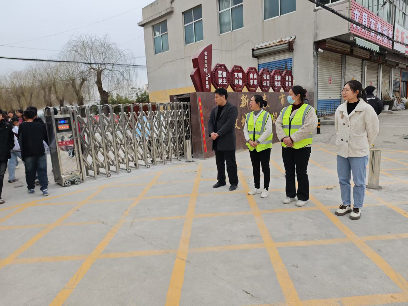 以筑牢校园安全防线、保障学生上下学人身安全为目标,由教师、家长志愿者及安保人员组成护学队伍,在校门口及周边240省道附近交通要道值守,负责疏导交通、引导学生安全通行、劝阻危险行为,打造家校社协同的平安上学路 。